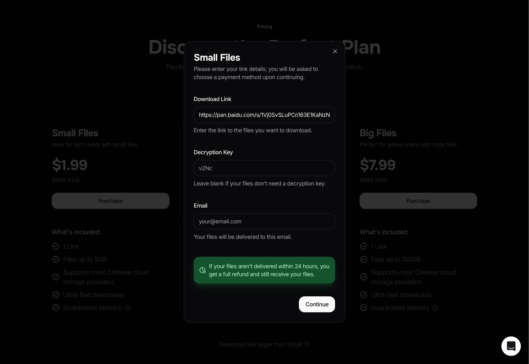 Submit your Baidu Pan link, decryption key if required, and your email address.